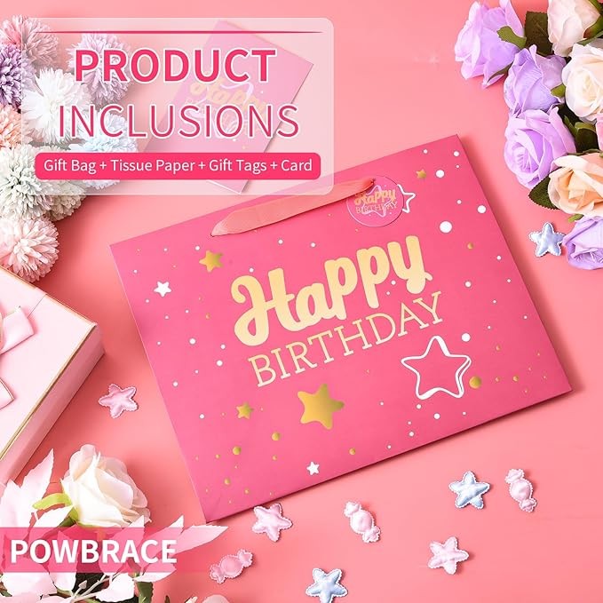 13" Pink Happy Birthday Gift Bag with Tissue Paper and Greeting Card for Party,Happy Birthday Gift Bag for Men Women,Gift Bags Medium size(1 PCS Pink Hot Stamping)