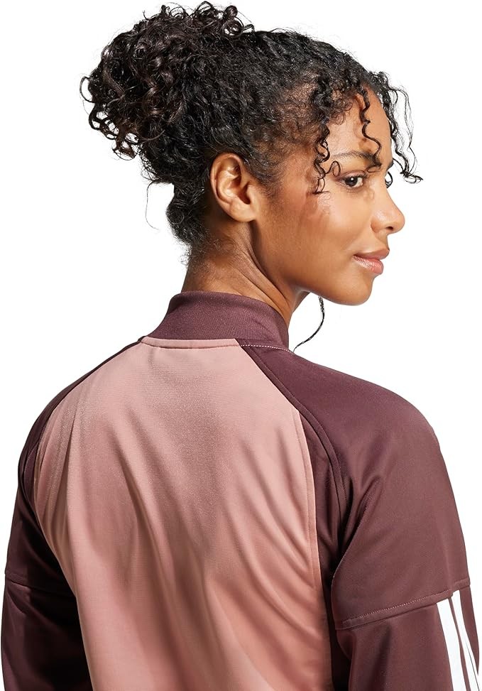 Women's knitted track top in a bomber cut and high-contrast colors.