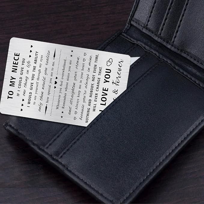 High Quality Material - This unique niece wallet card inserts is made of high quality stainless steel, Permanent Laser Engraved, very sturdy, will not fade