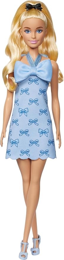 Barbie doll wears her long blonde hair in a bouncy ponytail It's topped by a black hair bow accessory that expresses her sweet personality