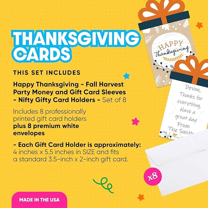 Happy Thanksgiving Nifty Gifty Card Holders Includes 8 professionally printed gift card holders plus 8 premium white envelopes. Each card holder fits a standard gift card or cash.