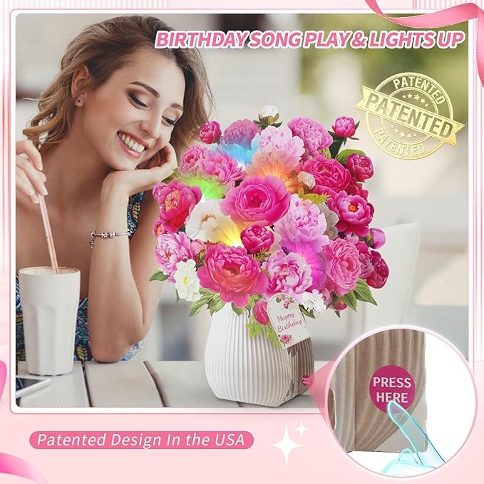Birthday Cards with MUSIC & LIGHTS, Pop Up Happy Birthday Cards, Pink Penoy, 12 Inch Life Sized Forever Flower Bouquet Greeting Card Gifts for Women Mom Grandma