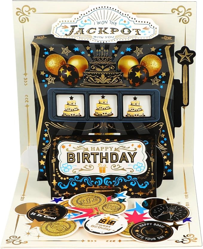 【Perfect Birthday Pop Up Card Size】: Hit the jackpot with your gift-giving! Our funny birthday gifts consist of 1 Pop Up Birthday Card (6" x 6" ) + 1 Exquisite envelope for easy gifting and mailing. This 3d Jackpot birthday card makes an excellent gift for birthday, sure to touch one's heart.