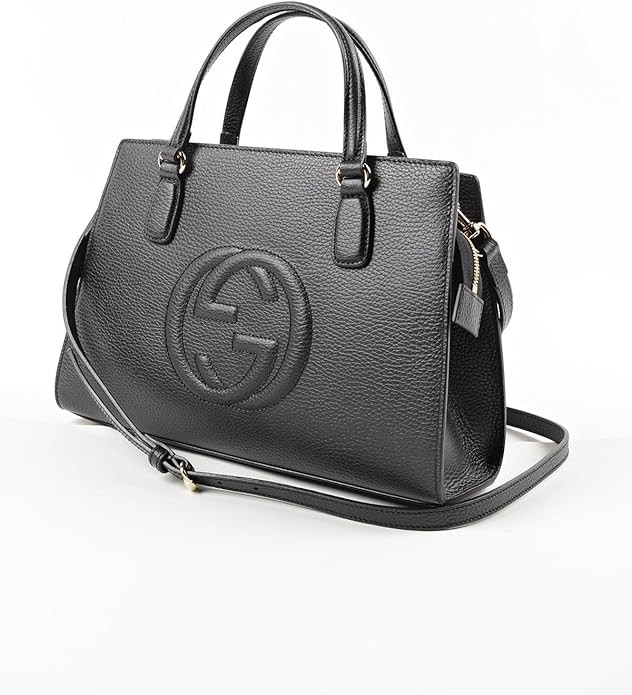 This beautiful Gucci Soho Tote with embossed interlocking GG logo is a stunning addition to any handbag collection. Crafted in beautiful black calfskin leather this beautiful piece can be carried by hand or by the detachable leather shoulder strap.