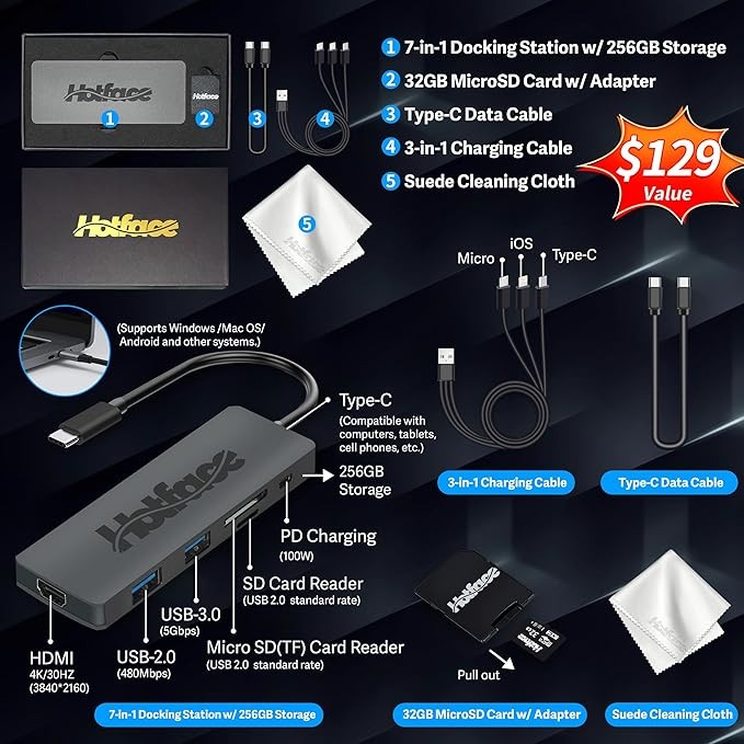 Windows 11 Home in S mode: Dimensions and Weight: 12.76 x 8.86 x 0.71 inches, 3.24 pounds. Ports: 1 x USB-C 3.0, 2 x USB-A 3.0, 1 x HDMI 1.4, 1 x Media Card Reader, 1 x Headphone/Microphone Combo, 1 x AC Smart Password. 1-Year Office 365: Bonus Docking Station Bundle: Includes 1 x 7-in-1 docking station with 256GB of storage, 1 x 32GB MicroSD card (with adapter), 1 x Type-C data cable, 1 x 3-in-1 charging cable, and 1 x suede cleaning cloth.