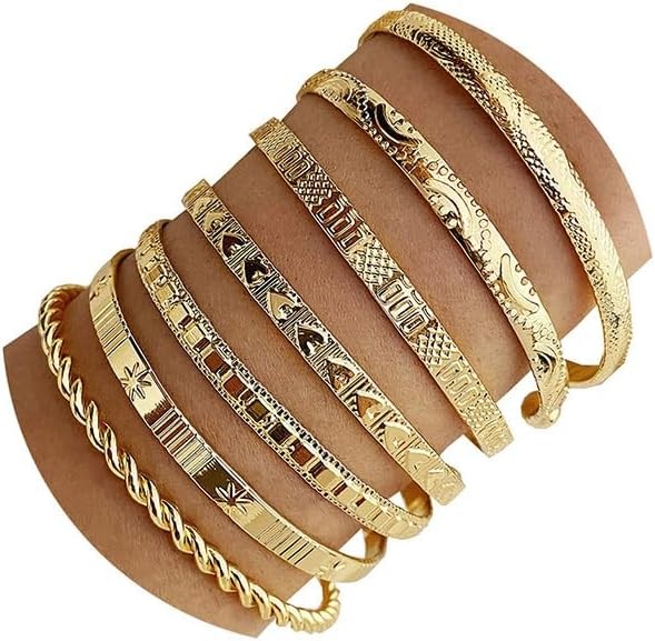 Gold Bangles Bracelets For Women 14k Gold Plated Multi Layered Stackable Cuff Bracelet Set Trendy Elegance Charms Non Tarnish Minimalist Textured Boho Jewelry Anniversary Gift Dainty Cute Adjustable Hypoallergenic Charm indian chunky