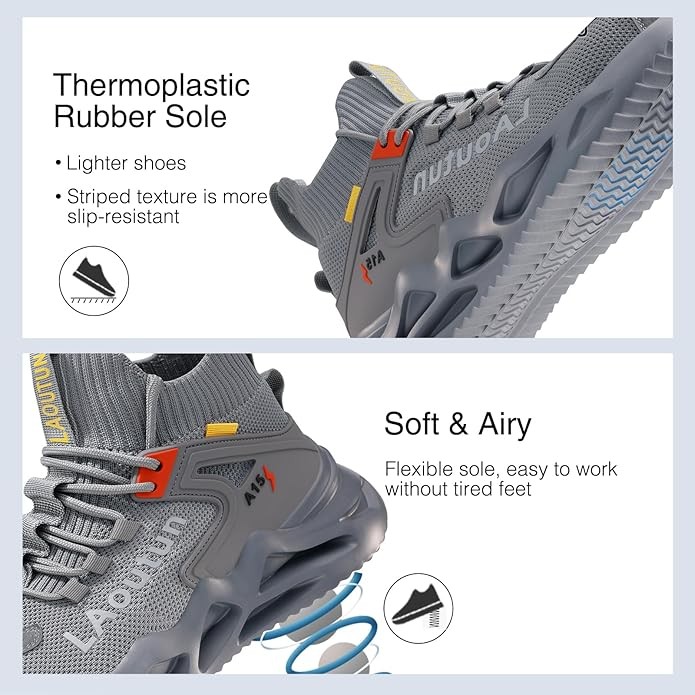 [Comfortable and breathable upper soft sole]: This steel toe shoe uses a thickened soft and lightweight sole to provide maximum cushioning and support for your feet, and a breathable tennis upper that keeps the shoe breathable and can keep your feet fresh and comfortable after a long day's work.
