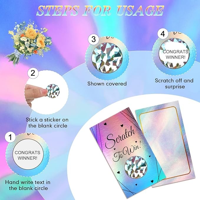How to use: these personalized scratch ticket comes with a blank space on which you can write your own gift; Give your customer or guest any prize you choose, and after you write the prize in a blank circle, stick your scratch sticker on it; The back of this card is blank so you can write a personal note or thank you to your customer or guest