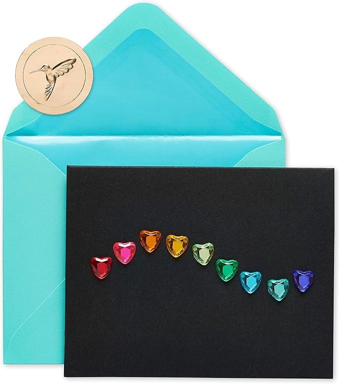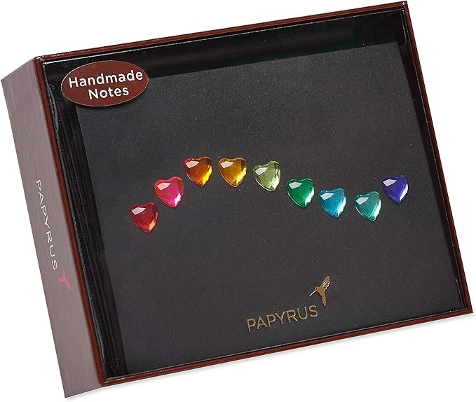 Papyrus blank greetings/cards feature shiny, heart-shaped gem attachments in a rainbow of colors on a bold black background.