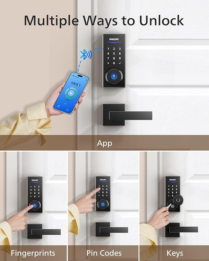 Philips Smart Lock with Handles, Keyless Entry Door Lock Set, Smart Door Lock with 2 Level Handles, Digital Keypad Deadbolt for Front Door, App Fingerprint PIN Code Unlocking, Auto Locking