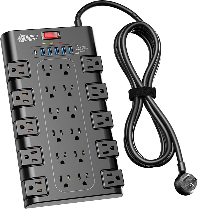 28-in-1 Multi-Function Power Strip: FCC and RoHS safety certified, with UL-listed extension cords and flat plugs. The Superdanny power strip surge protector features 22 grounded 3-prong outlets and 6 USB ports, providing power for all your devices that need to be plugged in, all in one place. Perfect for gaming or media setups, surround sound systems, TVs, phones, tablets, PCs, laptops, gaming PCs, lamps, and other devices.