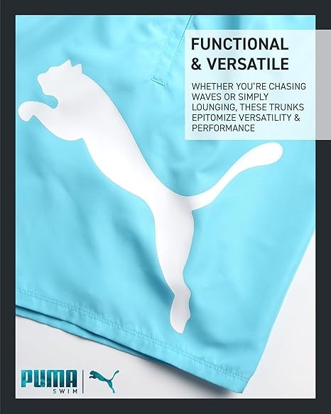 Quick Dry Performance: Dive into aquatic escapades with unwavering confidence in these meticulously crafted PUMA Men's Bathing Suit Trunks; Engineered with state-of-the-art quick-dry technology, these trunks ensure rapid moisture evaporation, guaranteeing you remain comfortably dry both in and out of the water; Bid farewell to the discomfort of soggy swimwear and revel in the freedom to enjoy every moment of your aquatic adventures without hesitation