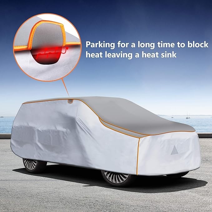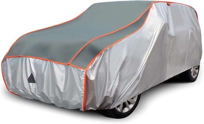 Heavey Duty Hail Protector : Anti-hail car cover is made of 150D polyester surround with a 3-layers padded top to protect even in stormy conditions.5 mm thick compressed,high temperature resistant elastic plastic (EVA) cotton fabric for all-weather protection. Extra thick layer for protection from extreme hail conditions (withstands up to category H6 damage on TORRO scale.