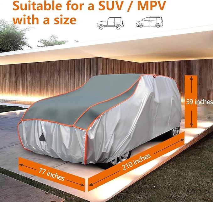 Snug Secure Design :Easy to put on and take off, snug buckle clips at the front and back to keep your car cover in place and to keep heavy wind from blowing it off. Measure:210*77*59 inches. Will easily fit all SUV , Suitable for small and Pick Up Truck.