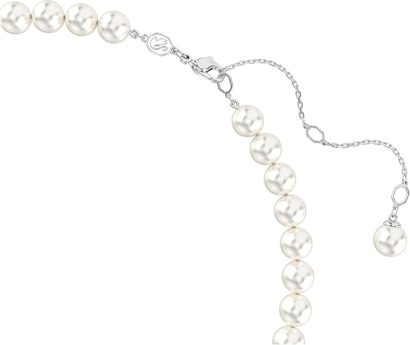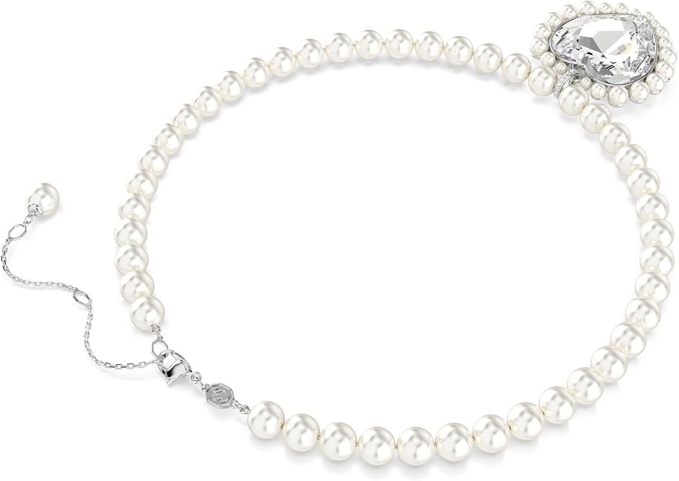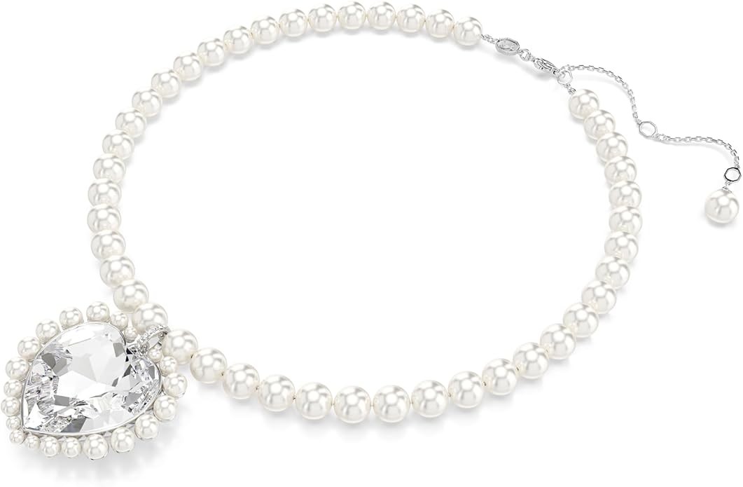 The rhodium plated design uses Swarovski Crystal Pearls to maximum effect, placing them around the necklace itself, and also in different sizes around the central heart-shaped crystal
