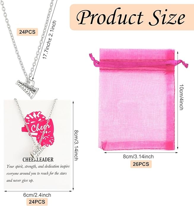 Complete Set for Cheer Teams: This set includes 24 megaphone styled cheerleading necklaces, each engraved with the word "cheerleader". Accompanied by 24 inspiring cheerleading cards and 24 pink drawstring bags, it's suitable for equipping an entire cheerleading team or for sharing at cheer - themed parties. Whether it's a new season kick - off or a special event, this set has everything you need to boost team spirit